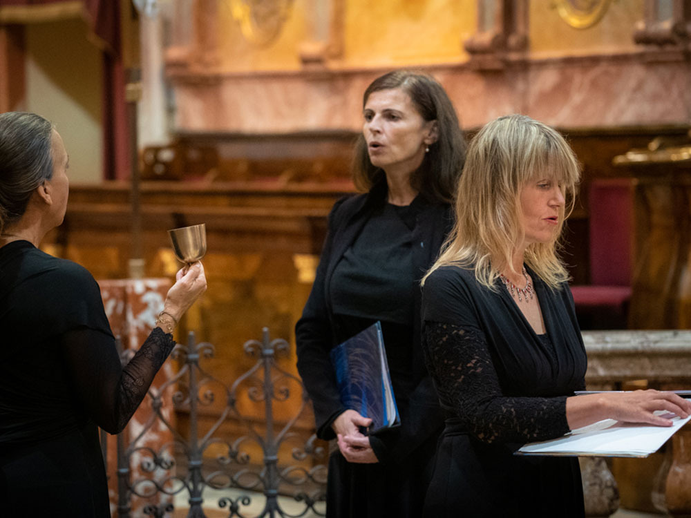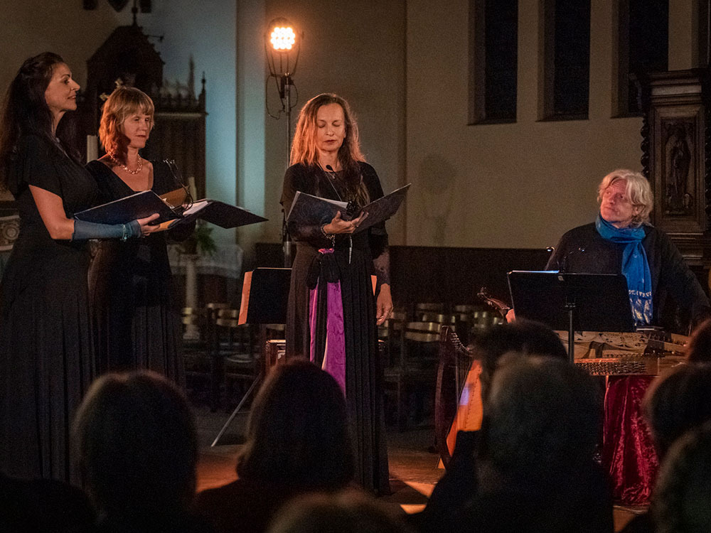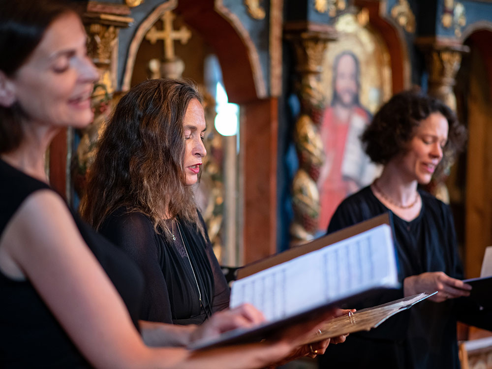 Zuerst absolute Stille – plötzlich beginnt eine glockenklare Frauenstimme eine kostbare Melodie in den Kirchenraum zu zeichnen. Weitere Stimmen schließen sich an, abwechselnd treten sie nun hervor, machen einander Platz, bilden einen Rahmen zur Entfaltung. Klänge von Harfe oder Hackbrett treten hinzu, sie durchqueren den Tonraum.